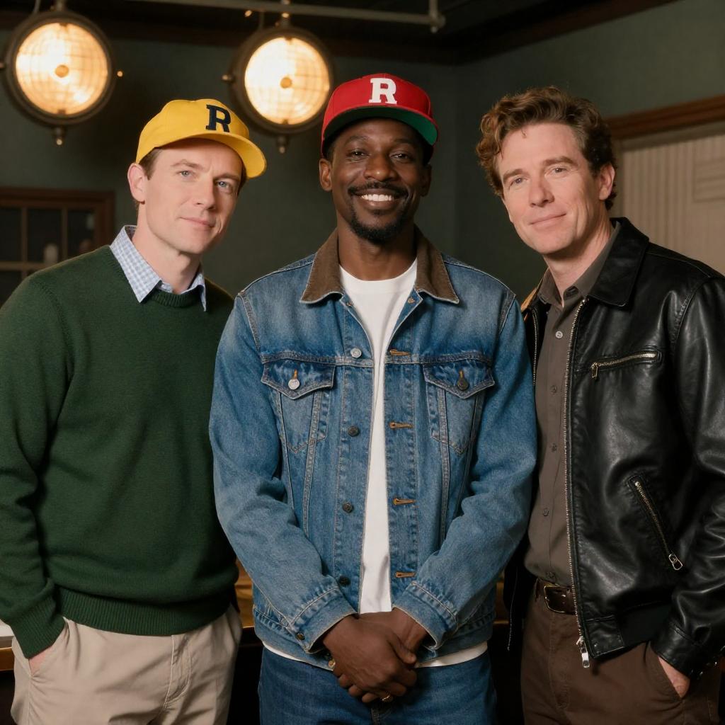 Photograph of three men in a vintage setting. The central figure, a smiling Black man in a blue denim jacket and red cap, stands between a white man in a yellow cap and green sweater, and a white man in a black leather jacket. Background includes industrial yellow lights and metal structures.
