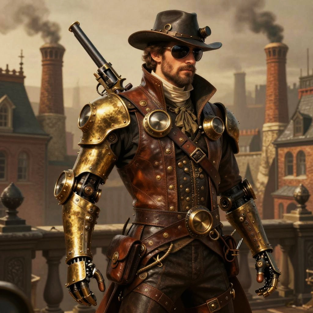 Portrait of Loidy as a steampunk adventurer, intricate mechanical gear and Victorian-inspired clothing, detailed background with steam engines and airships, warm sepia tones combined with metallic textures, high detail character focus.