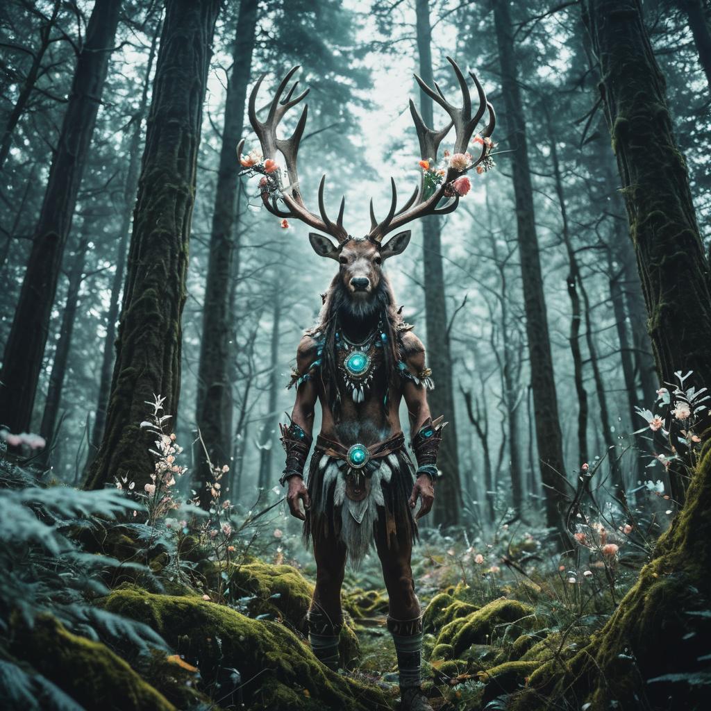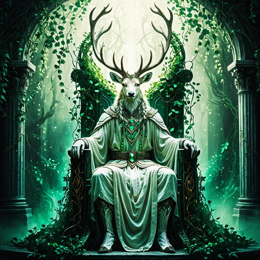 A serene statue of an ancient stag with large antlers in a meditative Buddha pose. The figure is adorned with moss on its robes and head, sitting peacefully on moss-covered rocks. The background features lush, misty mountainous terrain, evoking a mystical and tranquil atmosphere with vibrant earthy tones inspired by fantasy and anime art styles.