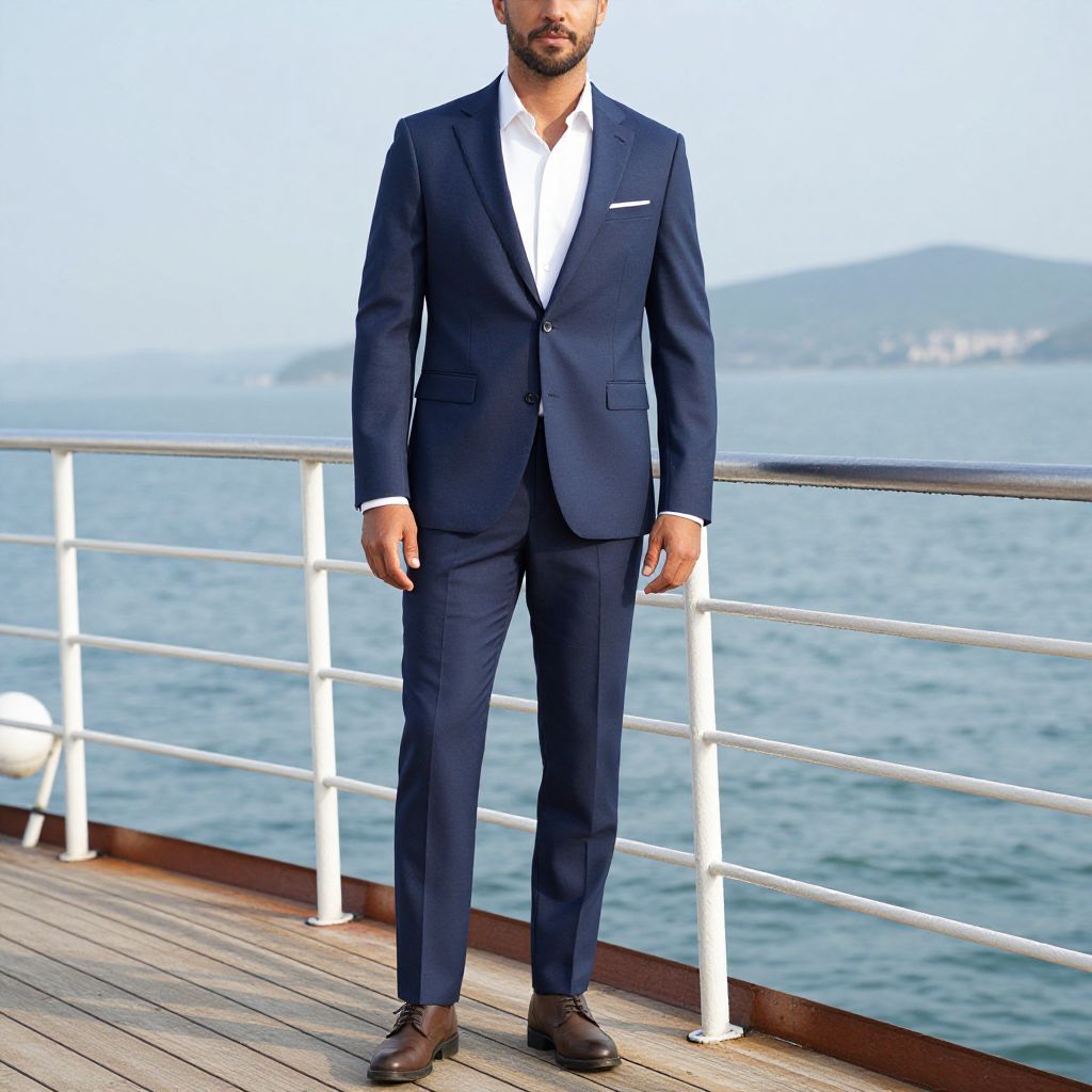 "Man Cruise Wear, dressed man in blue suit standing on a deck near a boat"