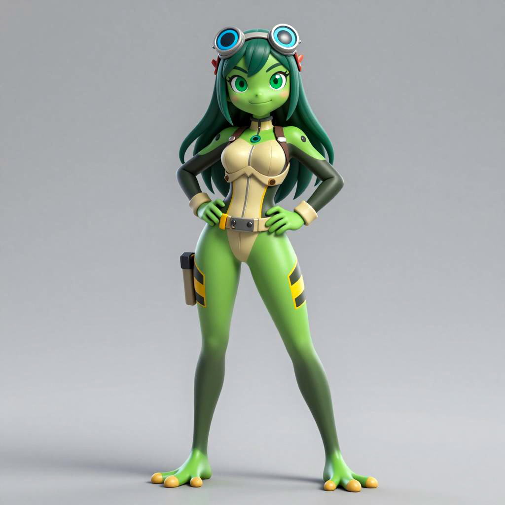 3D digital illustration of a female anime character with green skin-tight suit, black and yellow stripes, long dark green hair, frog-like goggles on head, large green eyes, beige gloves, beige belt with black buttons, standing with one hand on hip and other arm extended to the side, gray background, frog-like feet, confident expression.