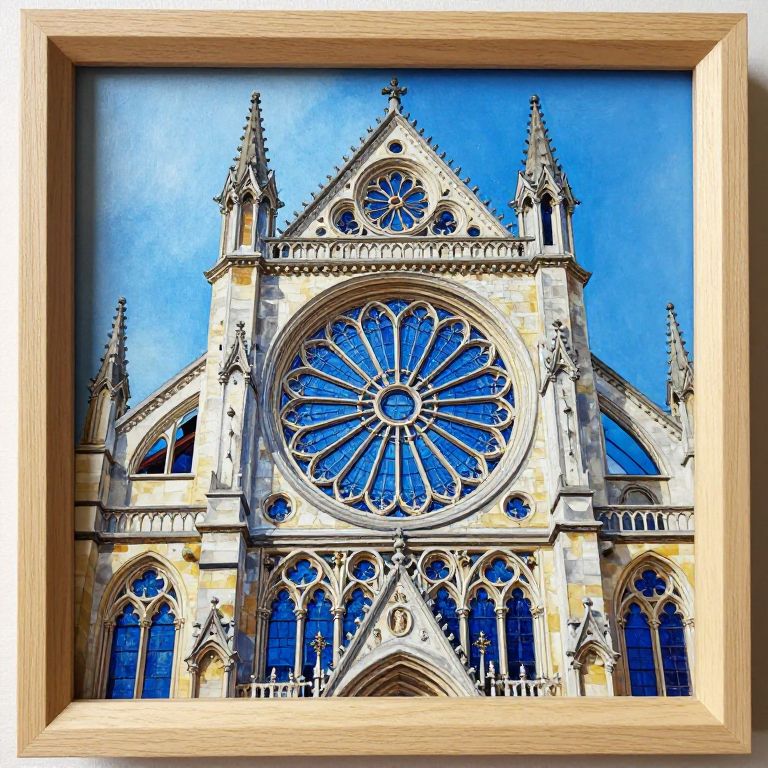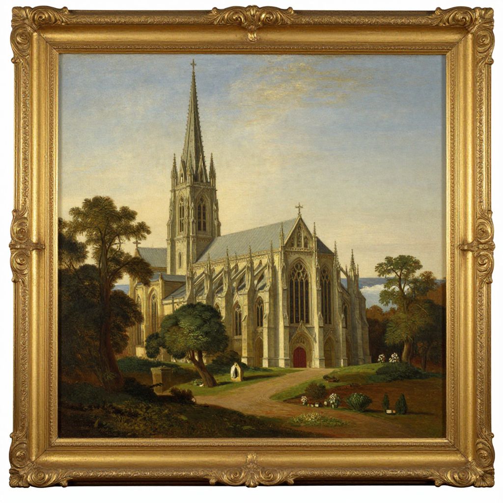 Ornate gold frame encloses a detailed, realistic painting of a Gothic-style church with a tall spire, surrounded by trees and a garden path