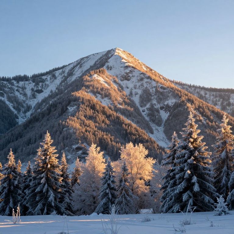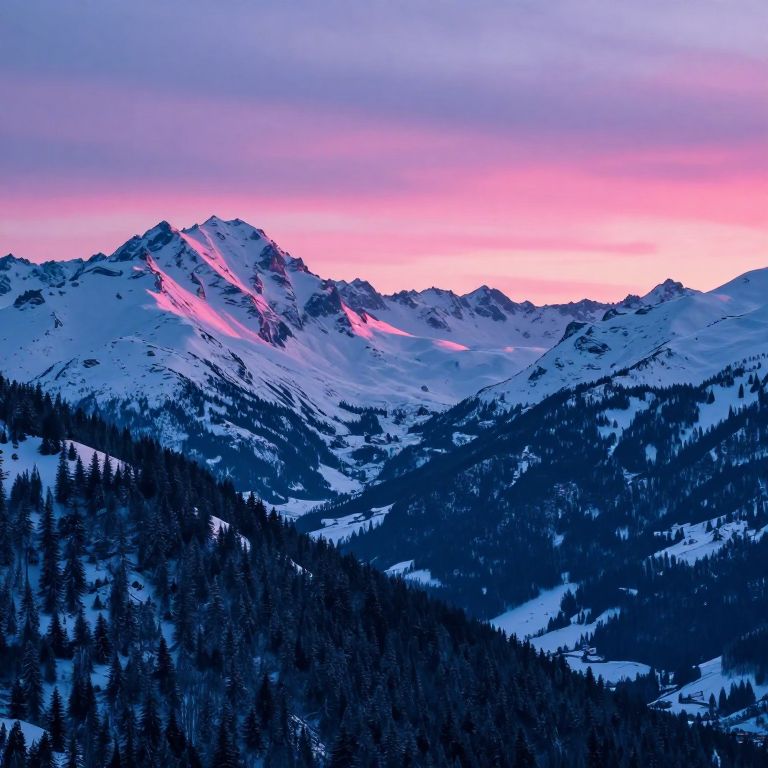 Sunset bathes the snow-covered peaks of Crested Butte in vibrant hues of orange and pink, casting a warm glow over the serene landscape as tall evergreen trees stand silhouetted against the twilight sky.