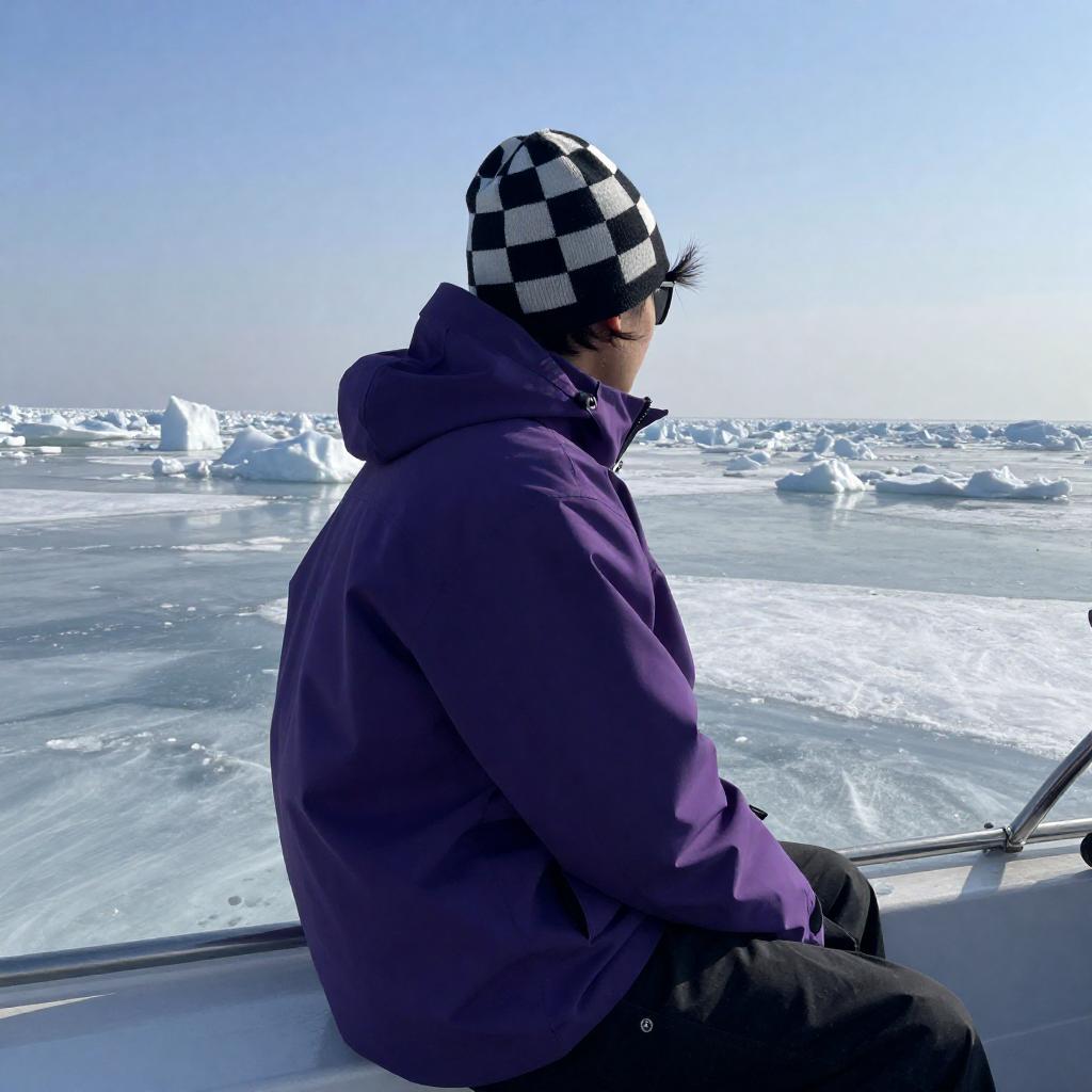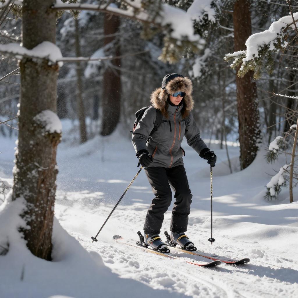 Person with a backpack, bending over, examining snow-covered ground. Snowy, uneven terrain with dark shadows. Cold, desolate landscape. Person's back facing viewer. Large, shadowy snow mound in the background.