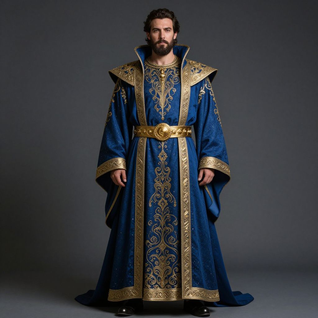 A regal man, with a commanding presence and a distinguished beard, is depicted wearing an elaborate blue robe adorned with intricate gold accents and cinched at the waist with a magnificent gold belt. Full body portrait, dramatic lighting, fantasy art, hyperdetailed.