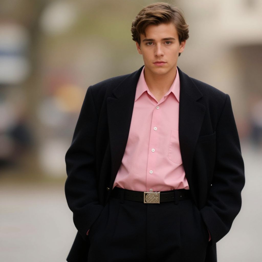 Photograph of a young Caucasian man with fair skin, brown wavy hair, and a serious expression. He wears a black blazer over a pink button-up shirt, black trousers, and a black belt with a silver buckle. His hands are in his pockets. The background is blurred, with muted colors suggesting an outdoor urban setting. The image has a shallow depth of field, focusing sharply on the man while the background remains indistinct. The lighting is natural, highlighting his facial features and clothing.