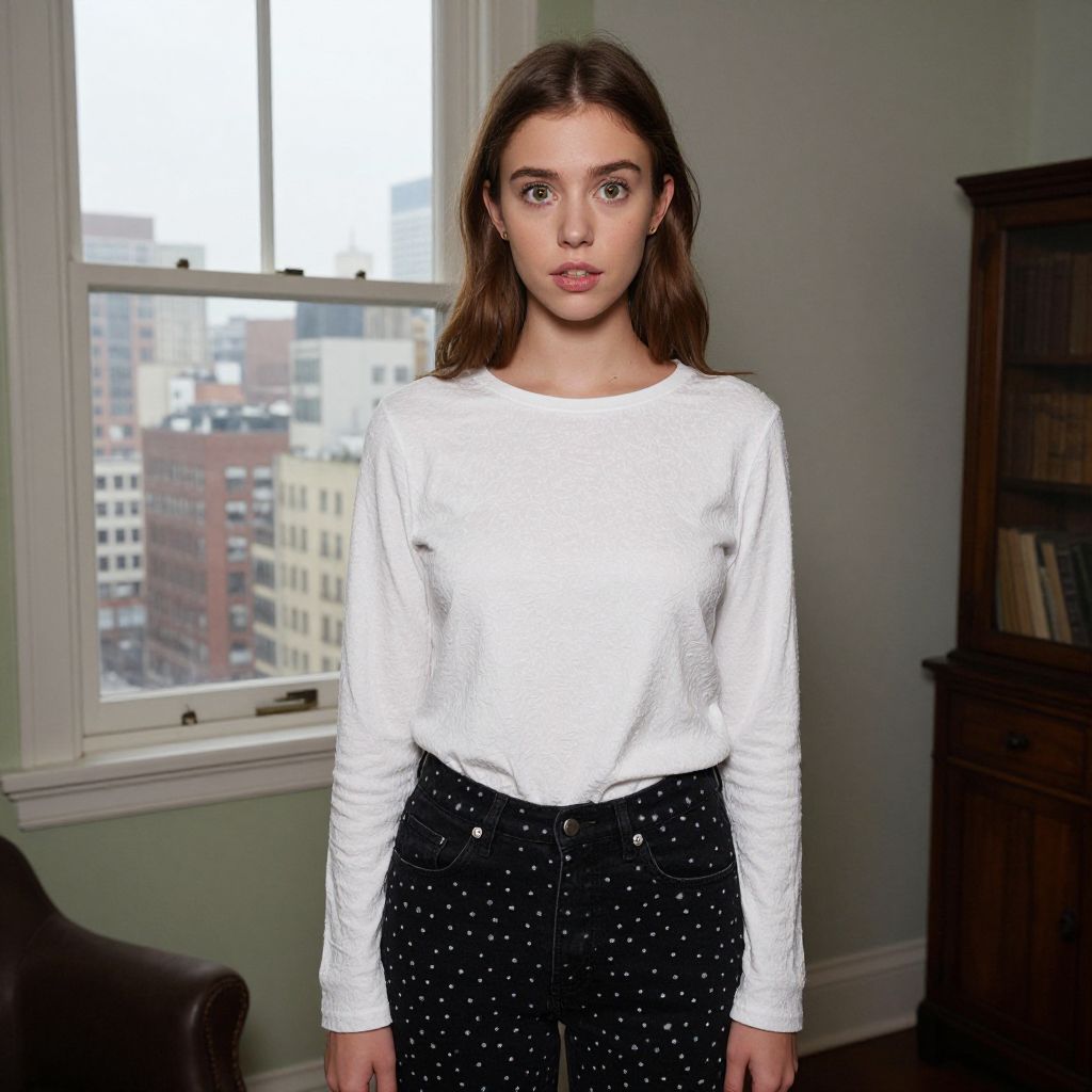A real woman in her late 20s with warm brown eyes, soft dark hair, and a natural complexion wearing a stylish sweater vest outfit as a costume, the vest is textured and in deep burgundy with pale blue polka dots, paired with high-waisted black jeans and ankle boots, standing in a dimly lit vintage warehouse with exposed brick walls and string lights hanging overhead, the atmosphere is cozy and theatrical, with a faint glow of candlelight reflecting off the fabric of her outfit. The woman has big tits and cute face
