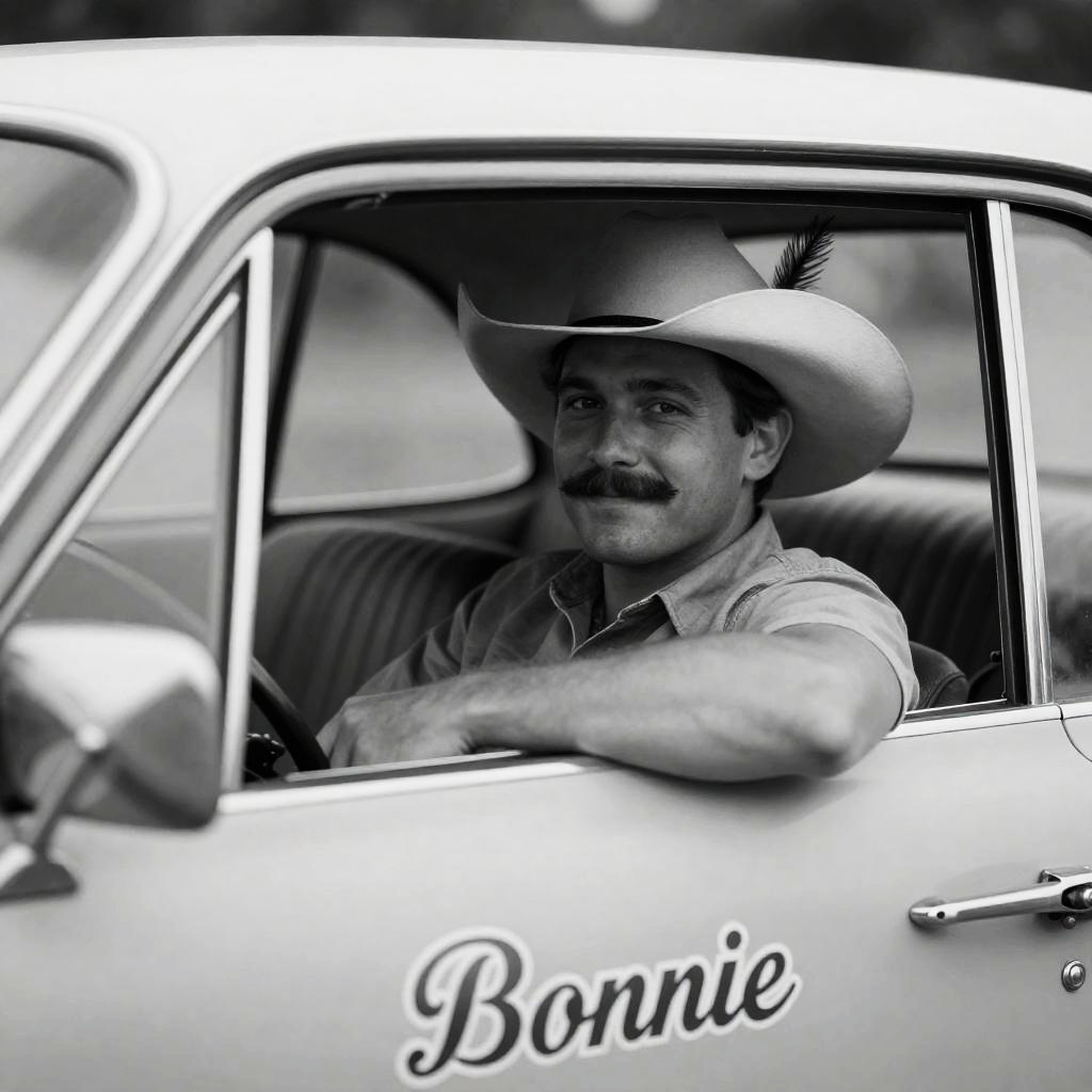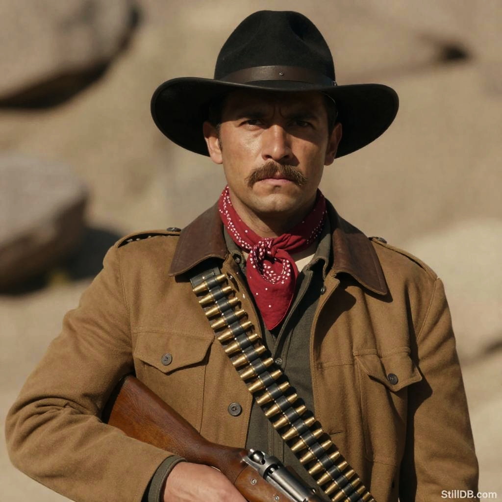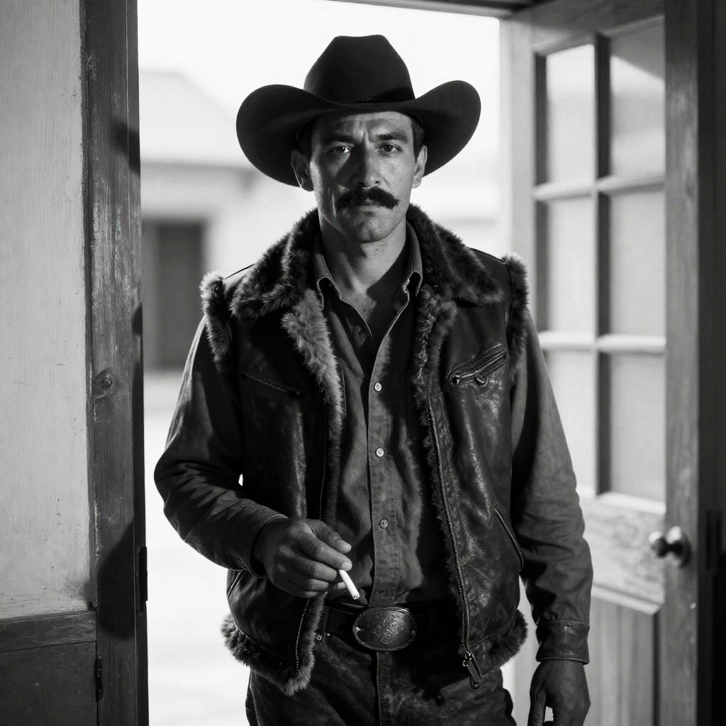 Black-and-white photograph of a rugged man with a dark mustache and stern expression, wearing a worn leather vest with fur trim, a button-up shirt, and a cowboy hat. He holds a cigarette in his right hand, standing in a wooden doorway. Sunlight brightens the background. Wooden door with glass panes on the right. Strong shadows and light contrast.