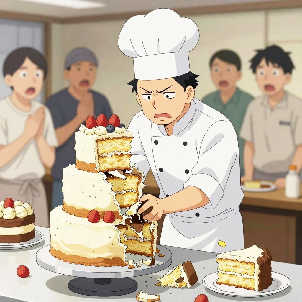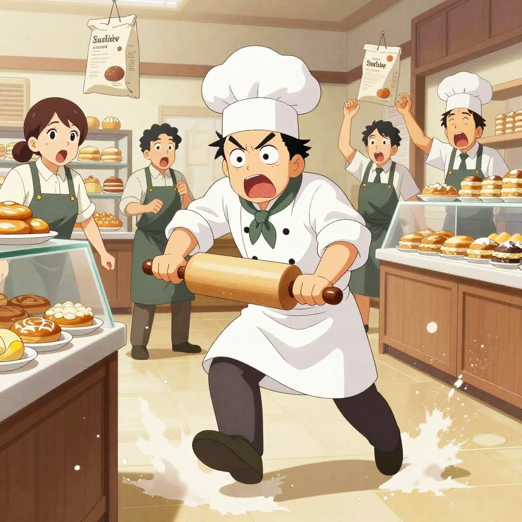 A frantic baker, with a panicked grimace, involved in a runaway dough incident in a small bakery, surrounded by flour clouds and tumbling pastries, drawn in the parody-rich and absurd style of Hideaki Sorachi.