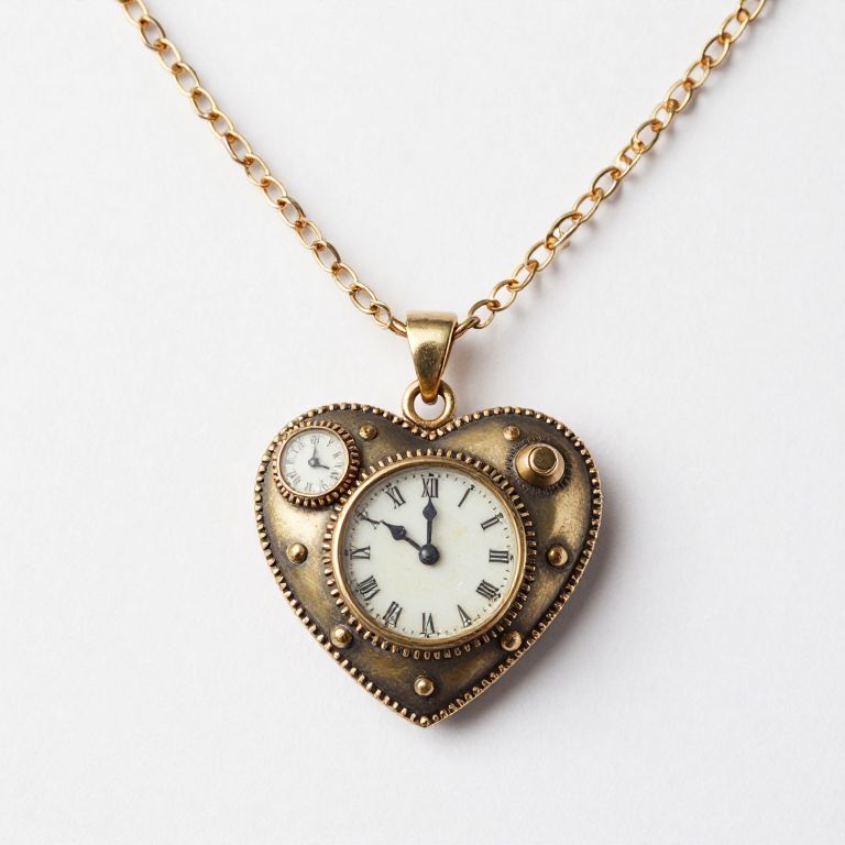 Elegant Steampunk Heart and Clock Necklace featuring intricate brass details, a central heart-shaped clock face with Roman numerals, flanked by symmetrical geometric pendants and bead accents, showcased by KreationsByKimH for $16.00.