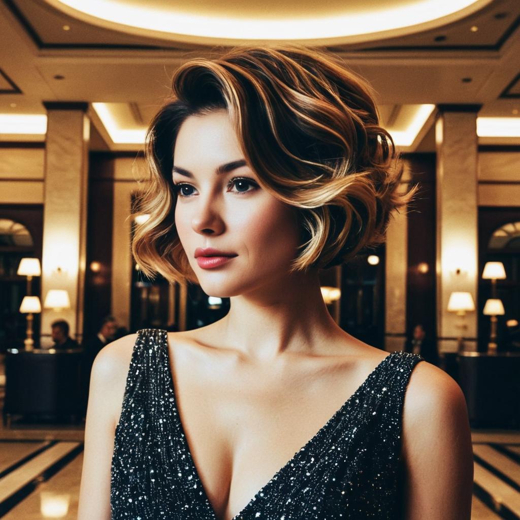 Short Blowout hairstyle on female, wearing elegant evening gown, in luxury hotel lobby, captured in fashion editorial style with warm highlights.