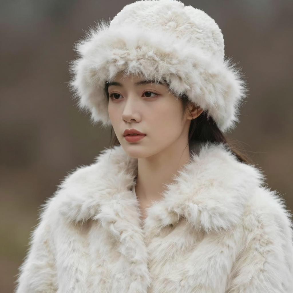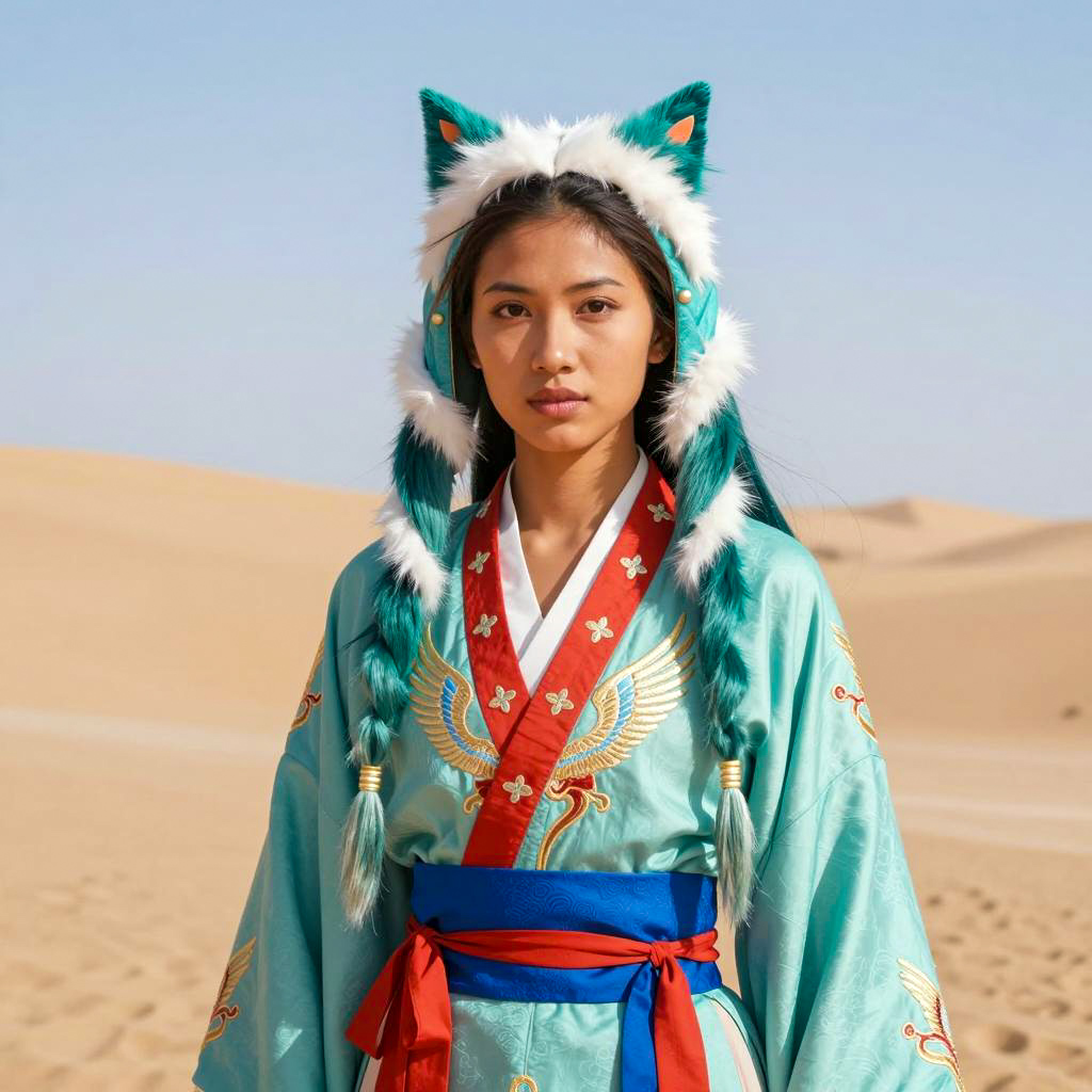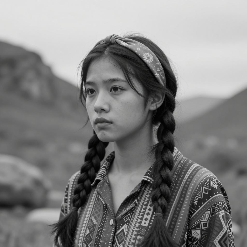 Portrait of a young woman with fair skin and dark braided hair wearing a white headband featuring red and black geometric patterns and an orange feather. She holds a lit match with red-painted nails, standing outdoors near a wooden totem pole, a forest, and a lake, with a campfire burning nearby.
