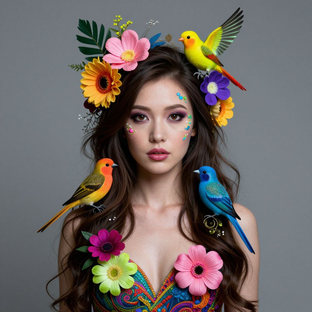 Photorealistic digital art of a young woman with long dark hair, wearing colorful flowers and birds in her hair and on her shoulders, against a gray