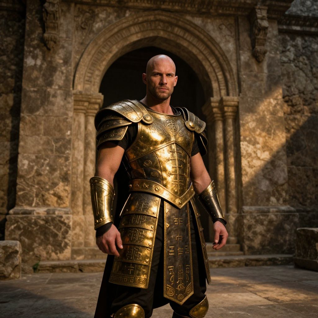 A man with a bald head is standing in front of a stone building. He is wearing a gold and black armor with gold accents. He has a muscular build, strong jawline, and intense gaze. His armor is intricately detailed with ancient runes and symbols. The stone building is weathered and ancient, with a grand archway leading into the shadows. The scene is illuminated by a dim, golden light filtering through the ruins, casting long shadows. The atmosphere is mysterious and imposing, evoking a sense of history and power.