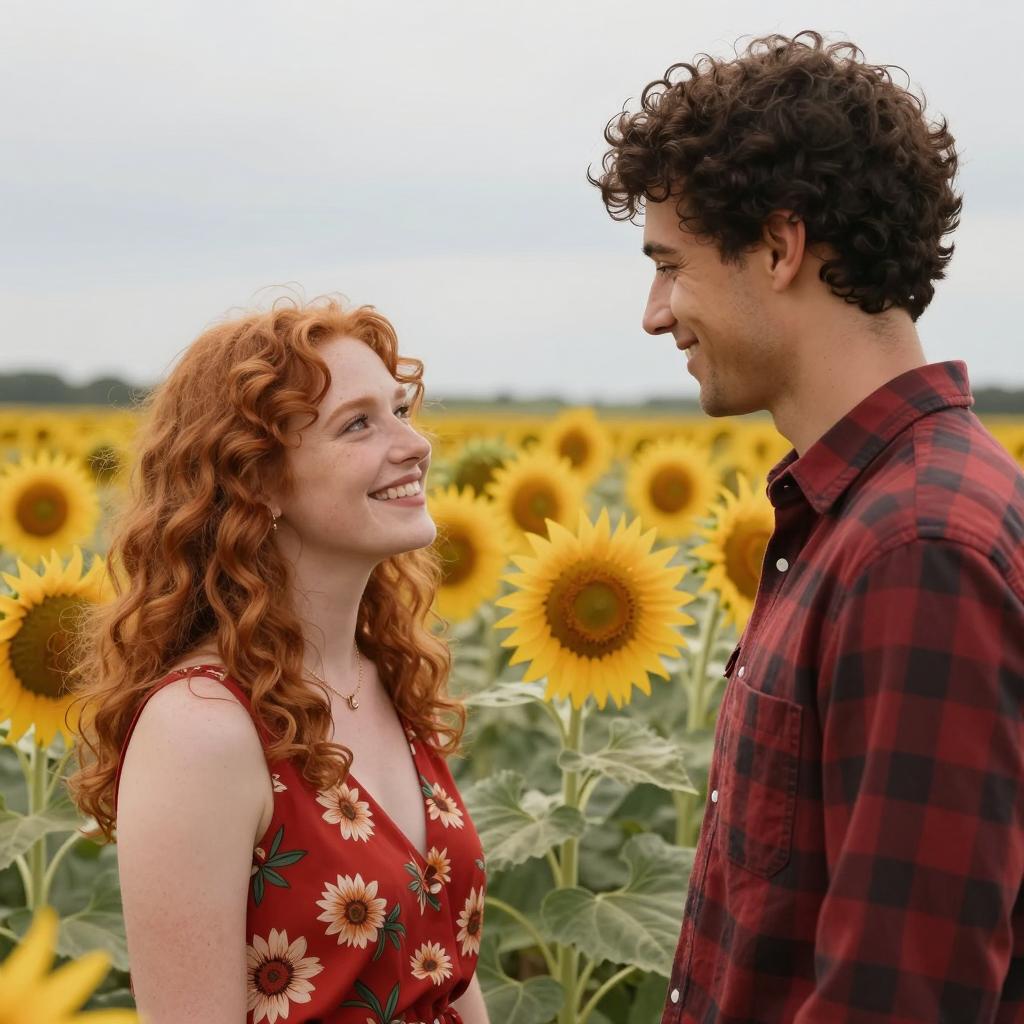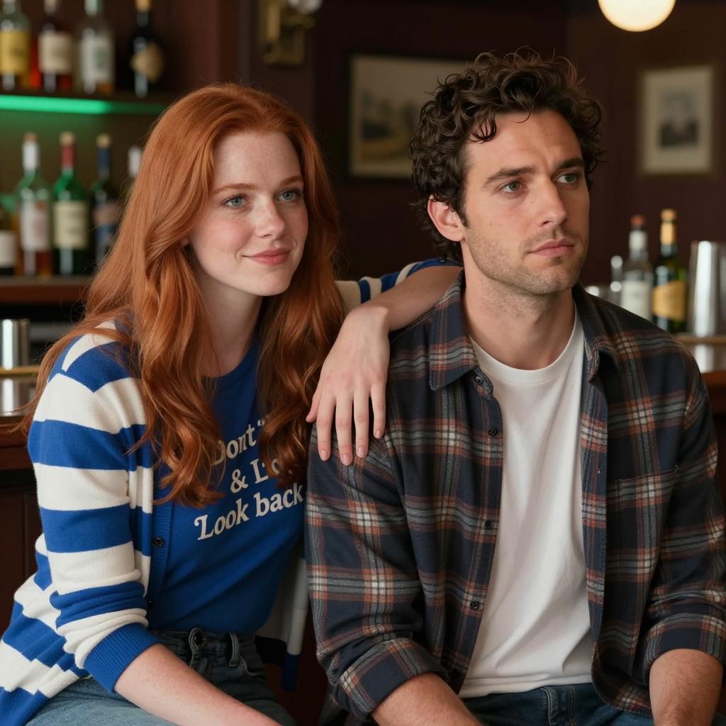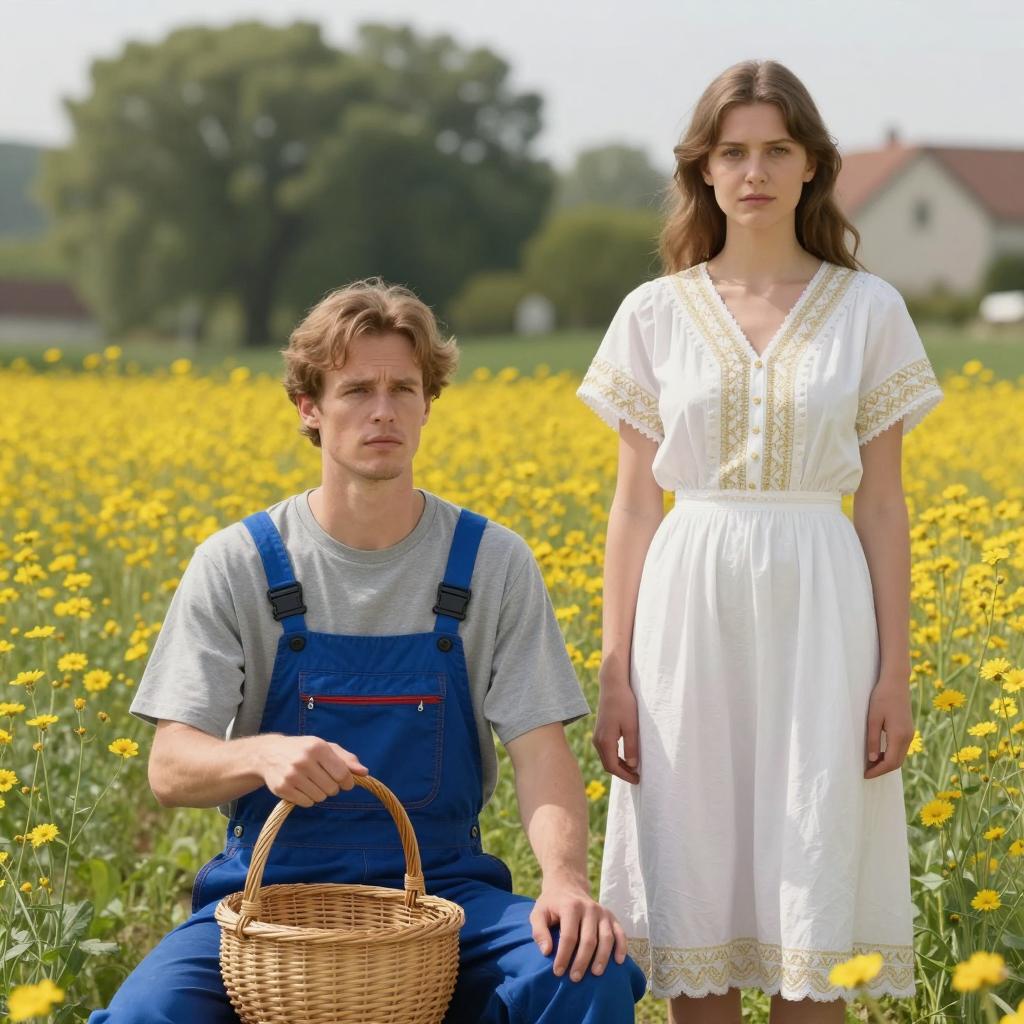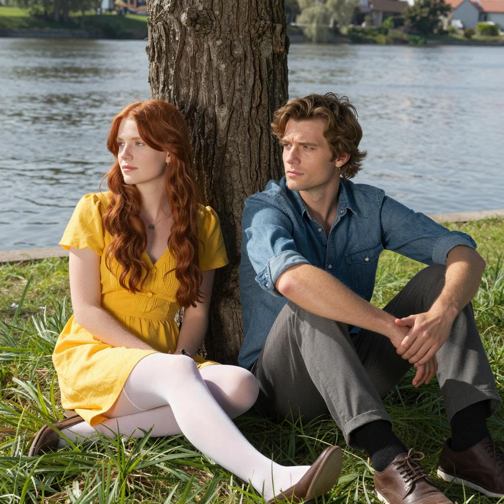 Two people under a large tree by a river. Woman with long red hair, yellow dress, and white stockings, sitting with hands in lap. Man with brown hair, blue denim shirt, and gray pants, sitting with hands on knees. Both looking away from camera. Green grass, tree trunk, and river in background. Bright sunlight.