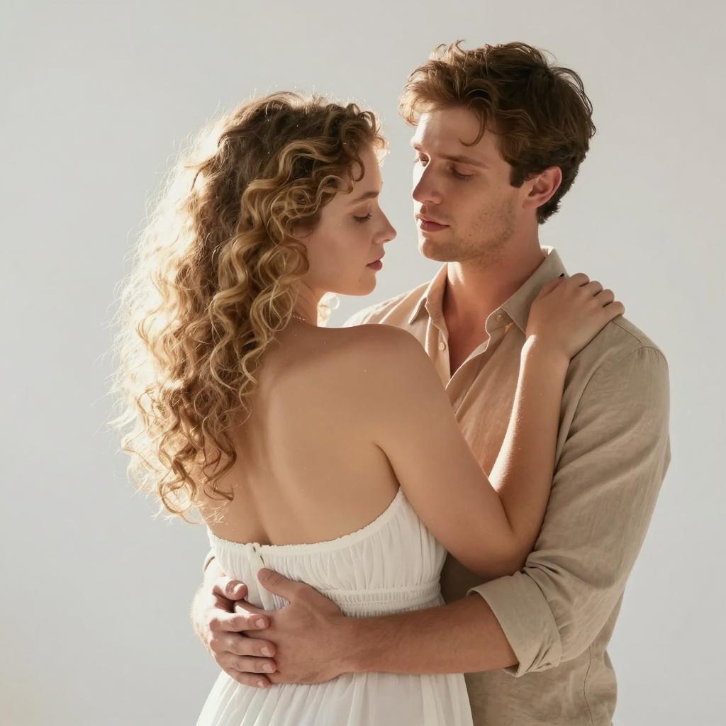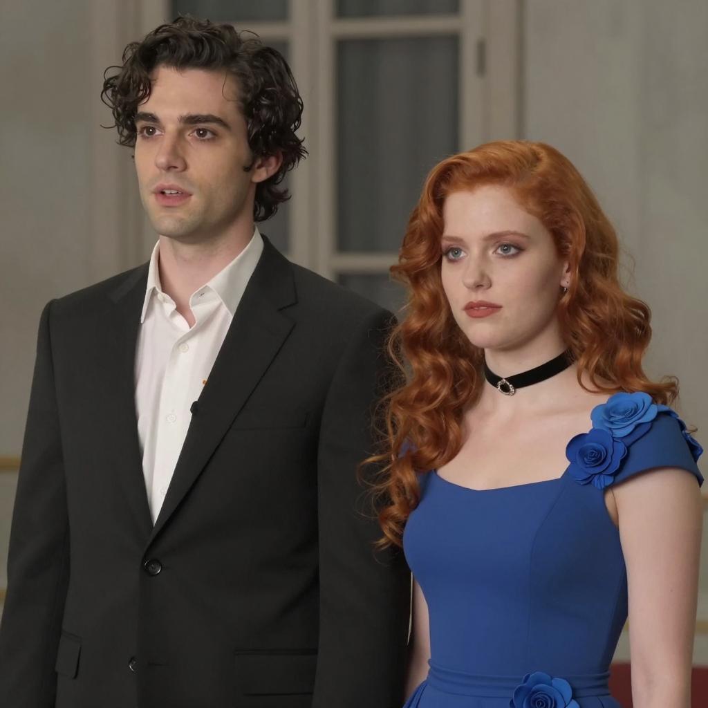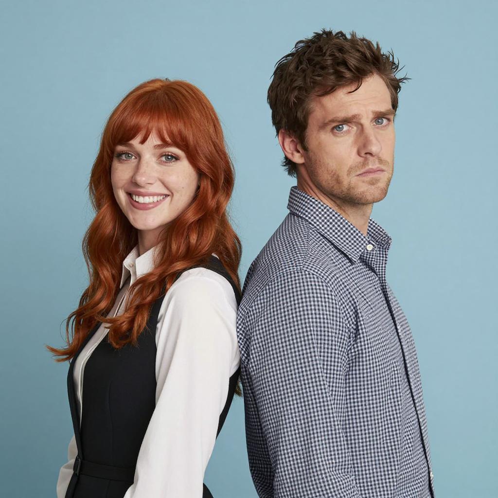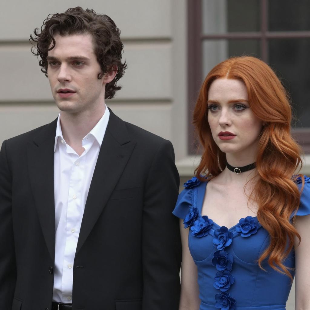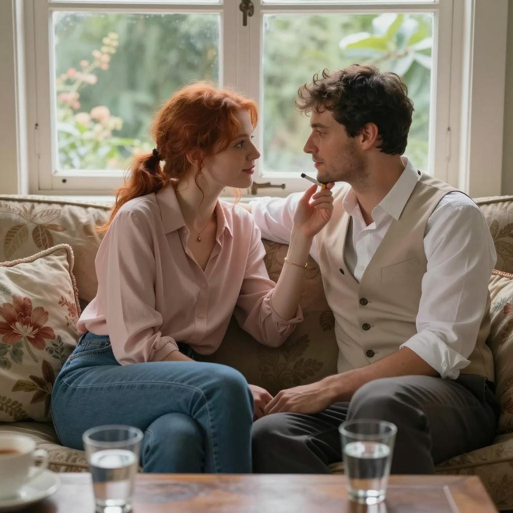 Two people under a large tree by a river. Woman with long red hair, yellow dress, and white stockings, sitting with hands in lap. Man with brown hair, blue denim shirt, and gray pants, sitting with hands on knees. Both looking away from camera. Green grass, tree trunk, and river in background. Bright sunlight.