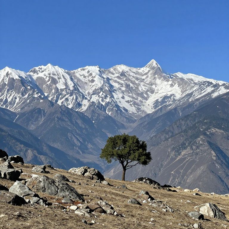 A picturesque mountain range with snow-capped peaks, a lone tree, and a rugged, rocky landscape under a clear blue sky.