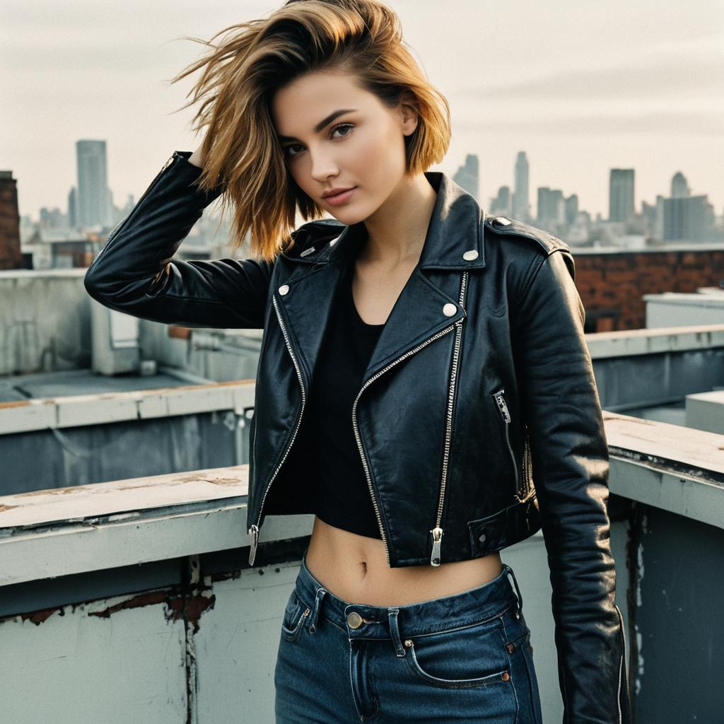 Young woman with a faded crop hairstyle wearing a black leather jacket and fitted blue jeans poses confidently on a rooftop with a city skyline in the background. The image is captured in a warm, editorial fashion style.