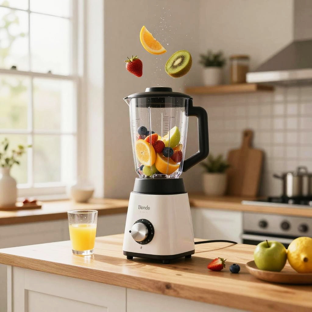 Blendr machine in action inside a bright Scandinavian-style kitchen, wooden counters, fresh ingredients flying mid-air as if mixed by magic, soft sunlight pouring through large windows, photorealistic style capturing motion and texture of fruits, glass, and liquid.