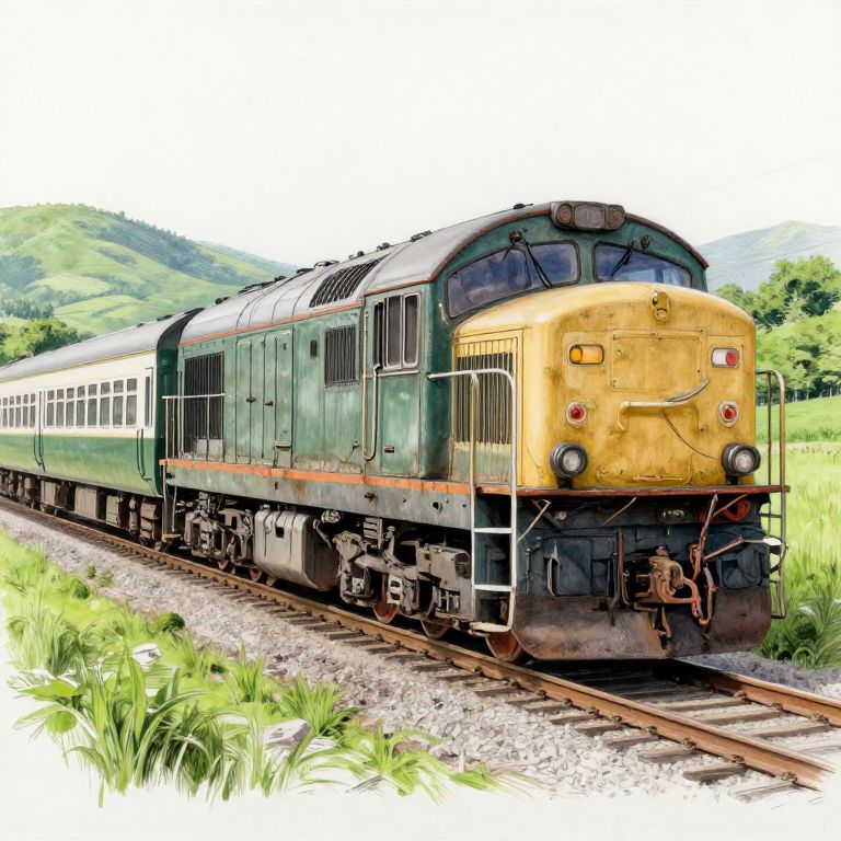 Realistic train drawing showcasing a scenic countryside railway with a classic diesel locomotive, lush green fields and rolling hills in background, finely detailed train components and weathered textures, pencil and charcoal medium rendering realistic shadows and highlights.