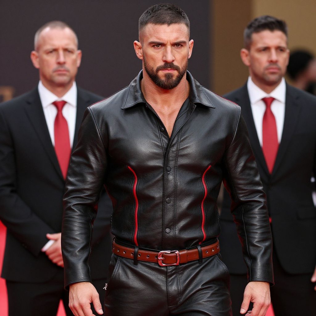 Photograph of a muscular, bearded man with short dark hair, walking confidently down a runway. He is wearing a sleek, black leather button-up shirt with red stitching and a matching leather pants, belted at the waist. Behind him, two men in black suits with white shirts and red ties stand with serious expressions. The background is blurred, focusing attention on the central figure. The lighting highlights the texture of the leather and the man's defined muscles. The overall style is fashion-forward and dramatic.