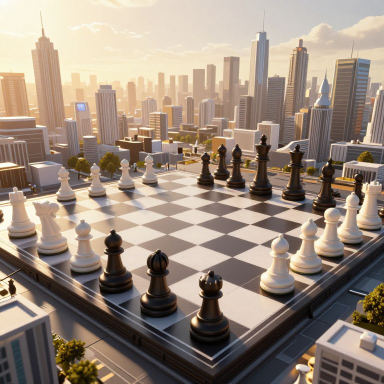 A surreal 3D-rendered scene depicts a colossal chessboard stretching into a futuristic cityscape, where oversized chess pieces stand as towering structures, blending seamlessly with the urban environment under dramatic golden-hour lighting, creating an illusion of strategic districts piloted by unseen players.