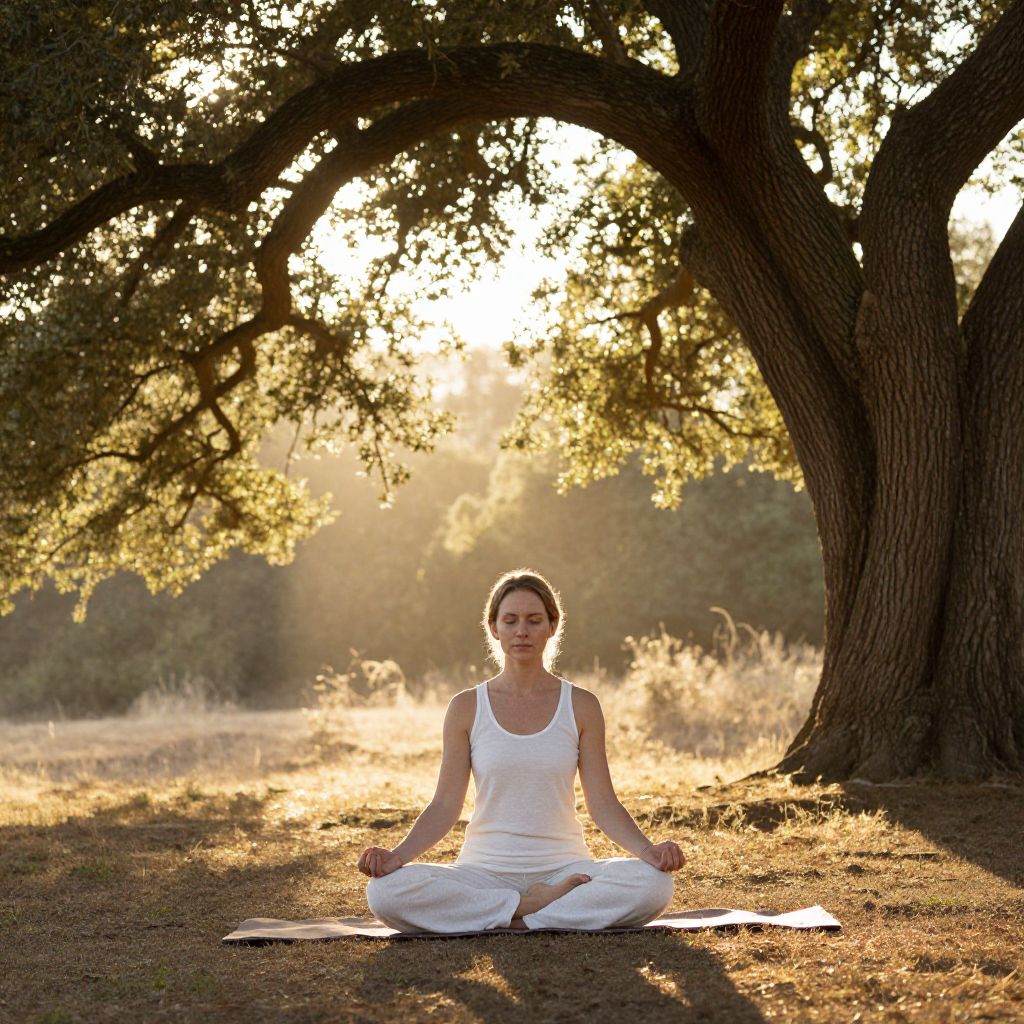 Photograph of a Caucasian woman with light skin and brown hair in a bun, sitting cross-legged on a forest floor at sunset. She wears a gray tank top and loose-fitting gray pants, with a calm expression and closed eyes. She is positioned in front of a large, dark tree with sprawling branches, casting shadows. The background is a sunlit forest with golden light filtering through the leaves, creating a serene atmosphere. The ground is covered in pine needles, and the overall scene exudes tranquility and focus.