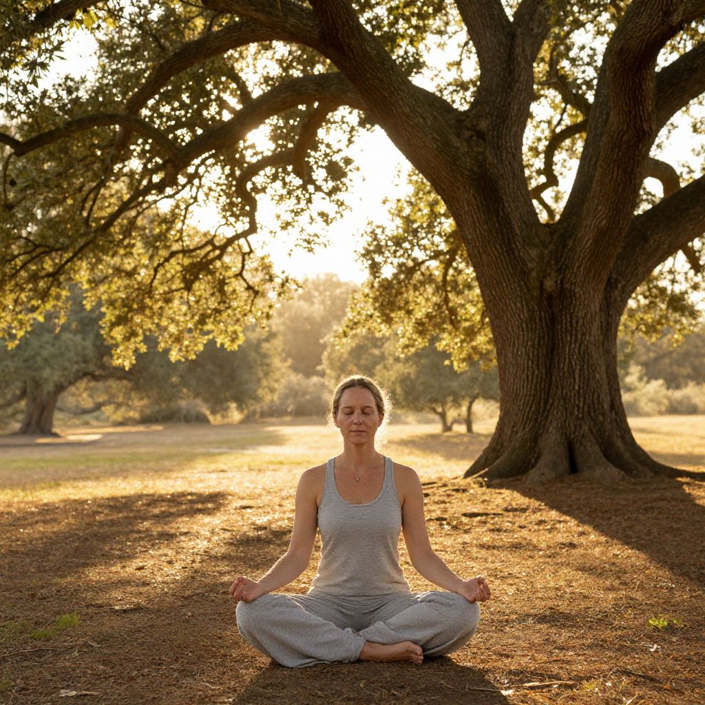 Photograph of a smiling woman with light brown hair in a gray tank top and pants, meditating cross-legged under a large tree at sunset in a