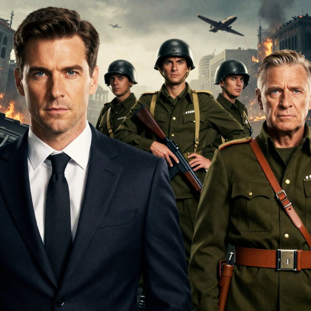 Photograph of a movie poster. Foreground: close-up of a serious man in a suit on the left. Background: three soldiers in green uniforms with helmets, one standing with hands on hips, others holding rifles. Right: older man in a green military uniform with an orange belt. Background: war-torn cityscape with flying planes and burning buildings.