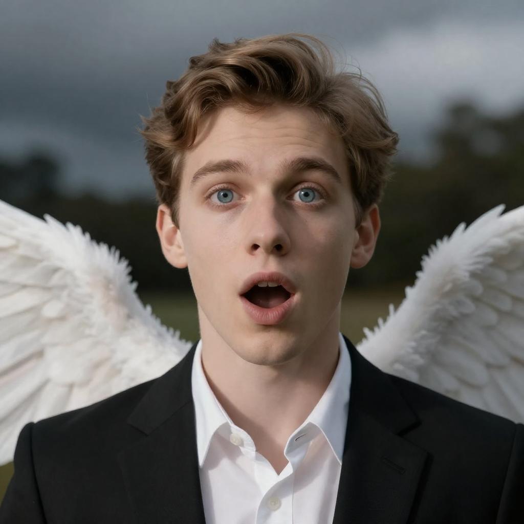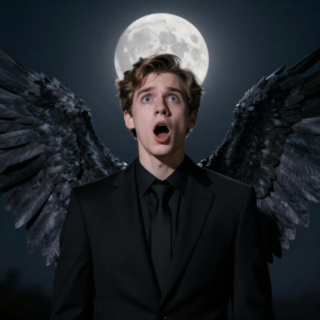 Photograph of a shocked young man with light brown hair, wearing a black suit, looking up with his mouth open. Dark gray wings frame his face. Full moon in the night sky background. Intense expression, wide eyes.