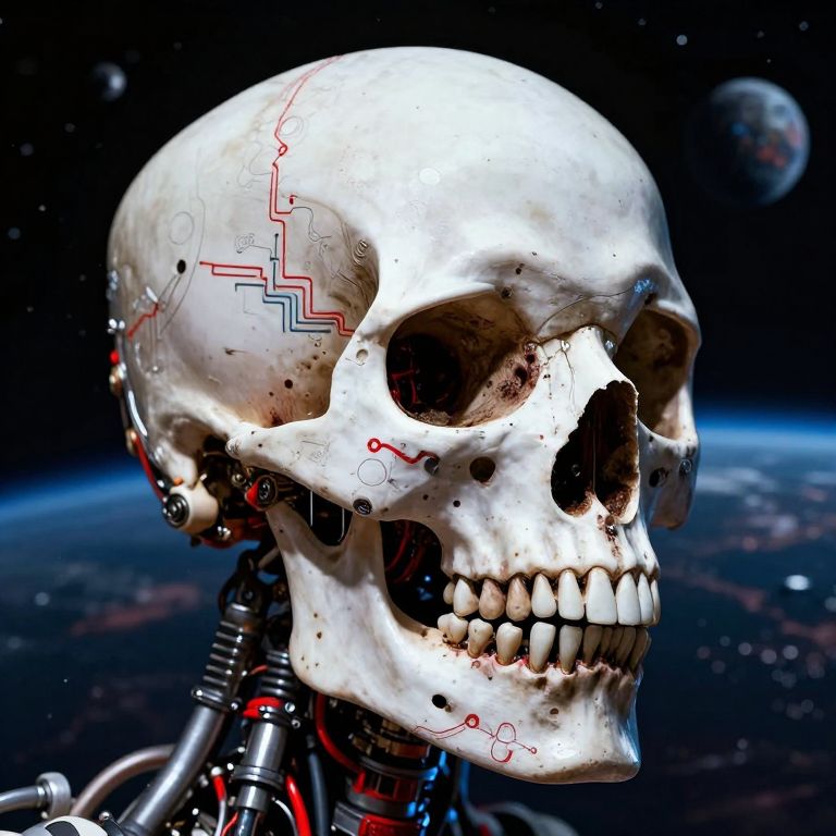 Skull of sci-fi cyborg with implants, space planet on the background, mix of the blood and electrical diagrams in the cyberpunk horror style, white colors, red colors, blue colors, little of gray colors