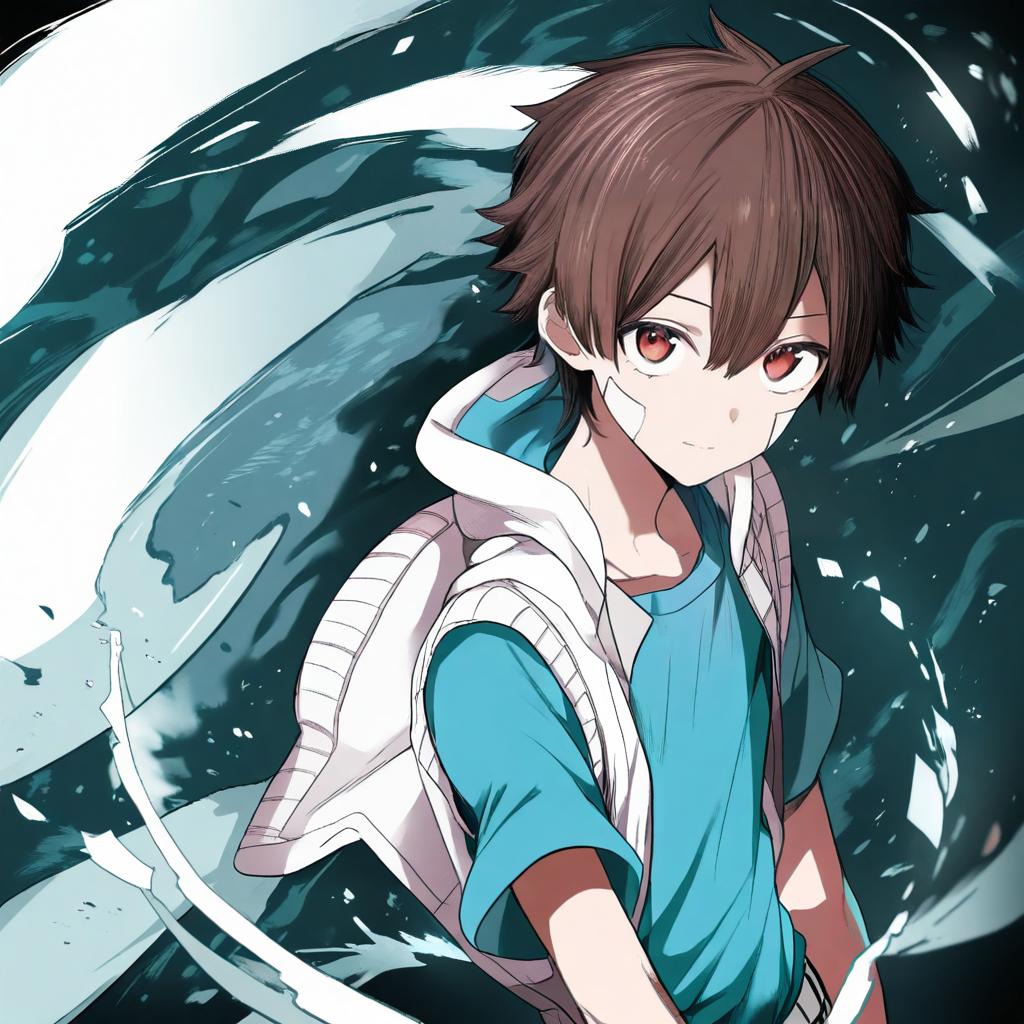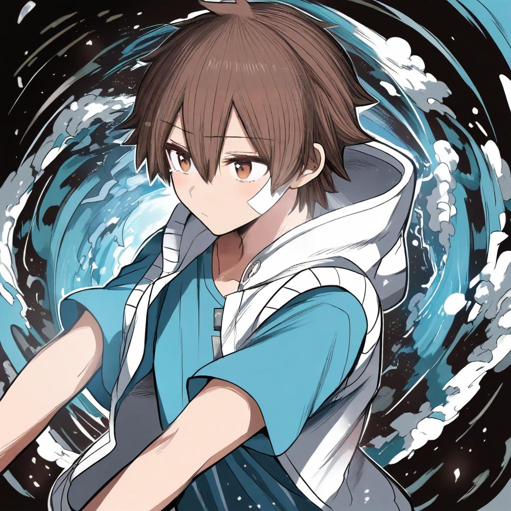 Digital illustration of a young anime boy with short brown hair partially covering his eyes, brown eyes, and a contemplative expression. He is wearing a light blue t-shirt with short sleeves and a sleeveless white hoodie with the hood down. The background features dynamic swirling blue and black patterns that add a sense of motion and energy. The artwork is inspired by the style of Amamiya Hibiya from the Kagerou Project, created by artist Zurikishi.