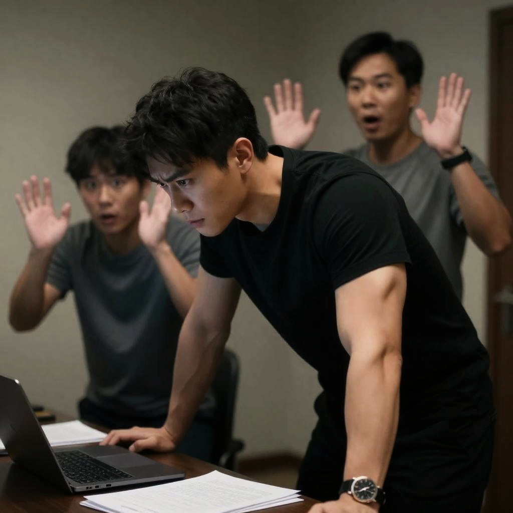 Photograph of three men in a tense scene. The central man with dark hair and a grimace is being grabbed by the shoulders by the man on the left, who has short dark hair and a concerned expression. The man on the right, with short curly hair, looks on intently. Bright, blurry background suggests an indoor setting.