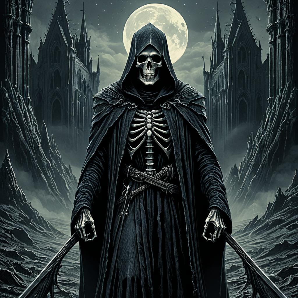 Dark gothic castle with numerous tall spires and turrets set against a night sky illuminated by a large full moon. The castle features intricate architectural details and is surrounded by mist and bare, twisted trees, creating a mysterious and eerie atmosphere.