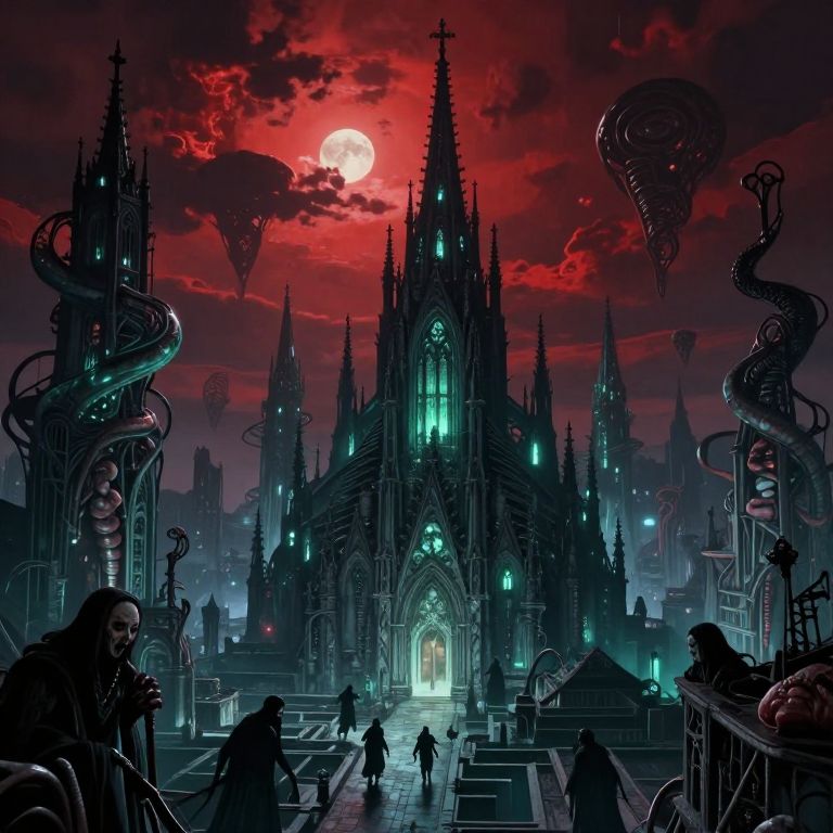 Dark, detailed comic-style illustration of zombie-like creatures crawling towards a glowing, ominous Gothic cathedral under a stormy green sky.