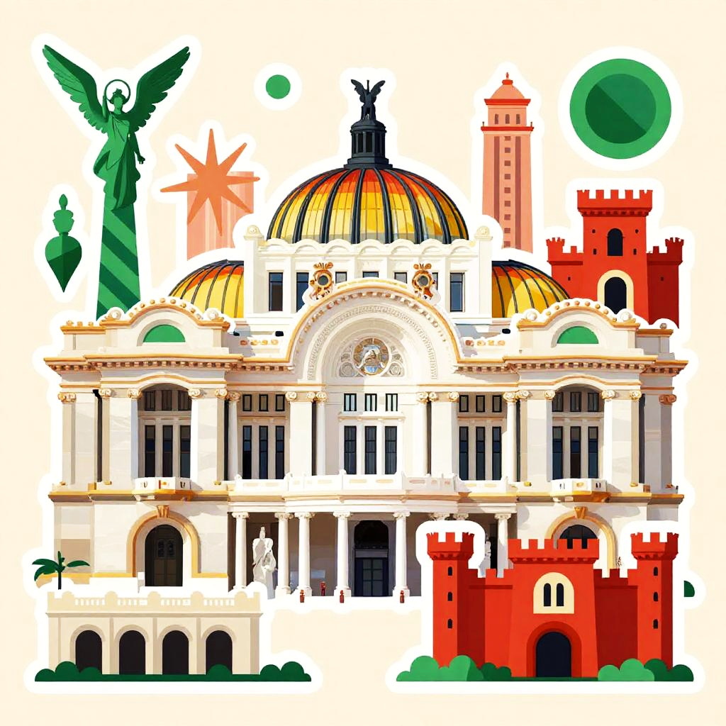 Marrakech landmarks like Jemaa el-Fnaa, Koutoubia Mosque, and Saadian Tombs, depicted in a textured tribal vector illustration with warm desert tones. Abstract skyline style with sand dune reflections, earthy color palette, vintage postcard aesthetic
