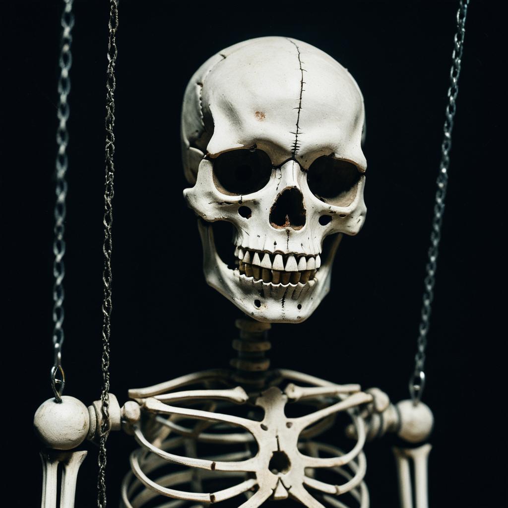 Hyper-realistic close-up image of a skeletal marionette puppet with detailed bone texture and visible joints, suspended by chains against a dark background. The image showcases intricate anatomical accuracy and an eerie atmosphere.