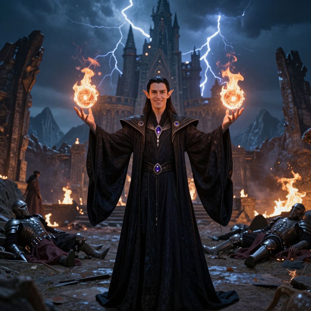 Fantasy Stormy night, Smiling elven mage in dark robes, The slim, black haired elf spreads his arms, summoning flaming spheres and fireballs, The elf is wearing long black robes, ornate with silver and violet gems, The elf is an elegant, cleanshaven man with androgynous features and pale skin, He stands in the middle of ruined fantasy castle, The ruins are burning, bodies of dead armored warriors litter the ground, In the fark background there are dark rocky mountains and dark cloudy sky, crackling with blue lightnings