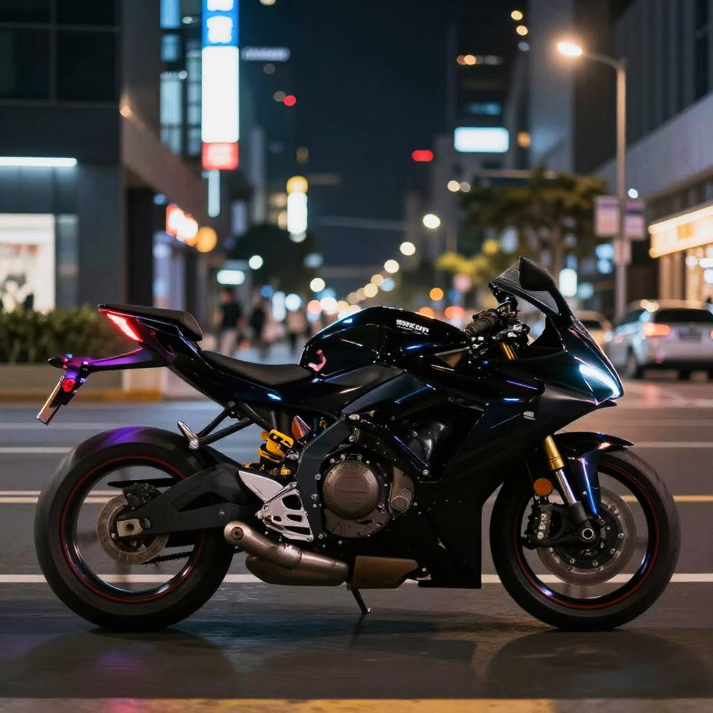Side profile black motorcycle speeding through an urban street at night, neon lights reflecting off glossy surface, sleek design, futuristic cyberpunk style