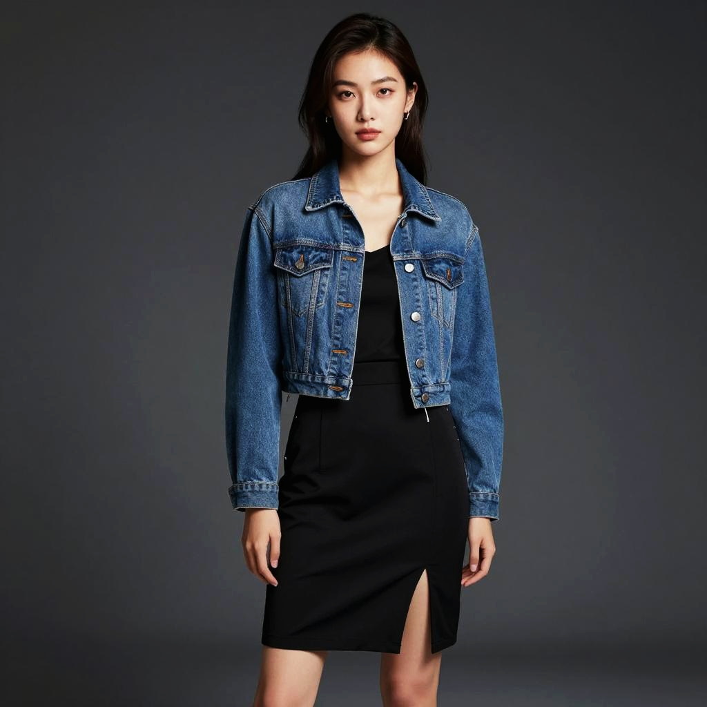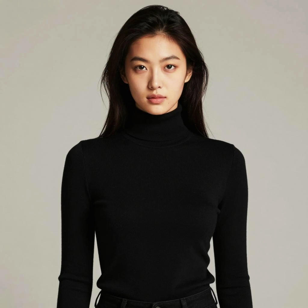 A striking portrait of a woman in a fitted black turtleneck, exuding confidence and poise against a muted backdrop. Her natural beauty is enhanced by soft lighting, highlighting her features and the sleek silhouette of her outfit.