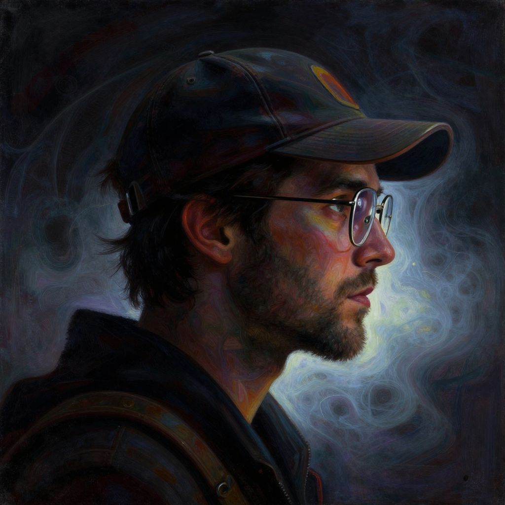 A dark and colorful close - up side profile portrait of a silhouette of a sci - fi young alien man with scruffy facial hair wearing a baseball hat and glasses. otherworldly glowing fog in the background. highly detailed science fiction painting by norman rockwell, frank frazetta, and syd mead. rich colors, high contrast, gloomy atmosphere, dark background. trending on artstation