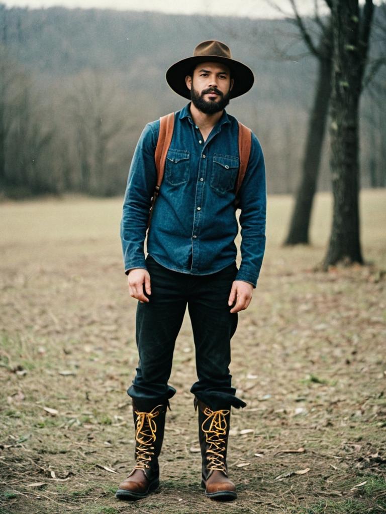 Film costume, 1boy, male focus, outdoors, hat, facial hair, blurry, standing, full body, day, solo, blurry background, long sleeves, boots, solo focus, beard