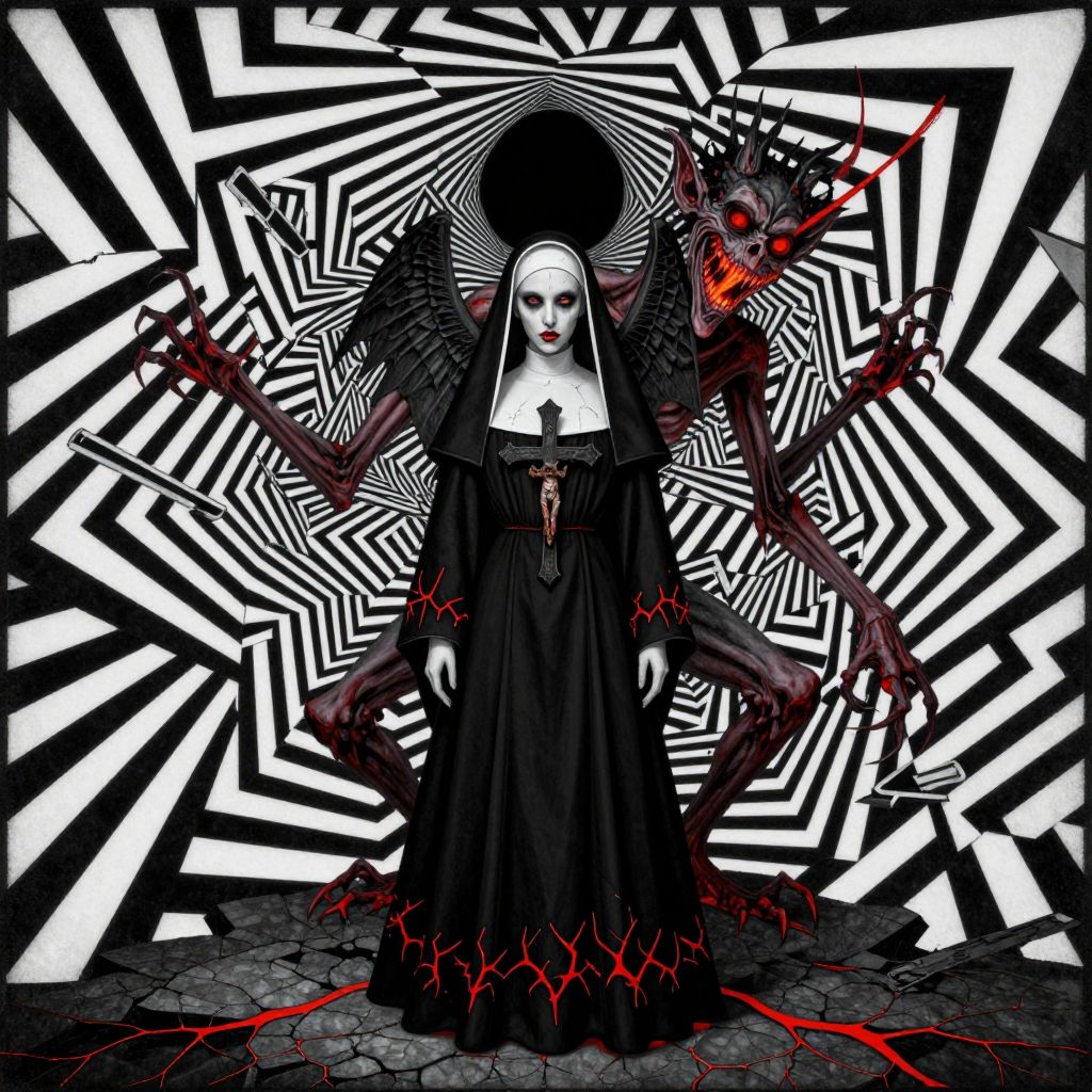 A surreal gothic digital illustration inspired by Hieronymus Bosch’s nightmarish figures and Bridget Riley’s dynamic optical illusions, depicting an unholy nun with pale, cracked porcelain skin and angular, blasphemous elegance, She stands rigid at the center, clad in a tightly fitted black habit that flows in angular, sharp folds, with blood-red stitching tracing jagged, vein-like patterns along the hem and cuffs, resembling dripping corruption, Her veil cascades like the dark wings of a fallen angel, framing a face that is both alluring and horrifying, with crimson lips, hollowed eyes devoid of pupils, and faint cracks spreading across her white visage, An inverted crucifix rests against her chest, sealing her ominous presence, The background is dominated by a pulsating optical illusion inspired by Riley’s \"Movement in Squares, \" but reimagined with sharp, chaotic black-and-white lines radiating outward in broken geometries that warp violently, pulling the viewer’s gaze into a dark central void, Behind her looms a devil-like figure with grotesquely elongated limbs, razor-sharp claws, and a twisted, fiery grin, its fiery red eyes appearing to pierce the illusion, The cold, cracked stone floor beneath her glows faintly with crimson veins, rooting the composition in infernal energy, The fusion of distorted geometry, gothic detailing, and surreal dread creates a masterpiece of eerie tension, gothic surrealism, flawless composition