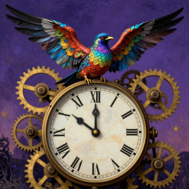 Craft an image that captures the whimsical essence of early 20th-century Russian avant-garde art with a surreal twist, evoking the dreamlike quality of early 1900s surrealist landscapes. Depict a fantastical bird adorned with iridescent plumage and intricate feather patterns resting atop an oversized vintage clock face, its wings spread as if about to take flight among the intricate gears. The scene should harmoniously blend timelessness and whimsy, inviting viewers into a realm where reality intertwines with fantasy. Utilize a rich color palette featuring deep purples, blues, and metallic golds to enhance depth and contrast within this imaginative composition, prompting contemplation on the enigmas of time and curiosity about the extraordinary adventures that exist beyond its reach.