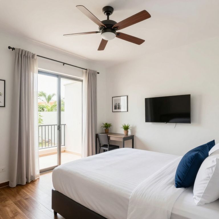 Well-lit bedroom featuring a neatly made bed with white linens and a navy blue pillow, positioned beneath a ceiling fan, alongside a wall-mounted TV above a small desk with two potted plants, framed by light curtains covering a glass door leading to an outdoor area.
