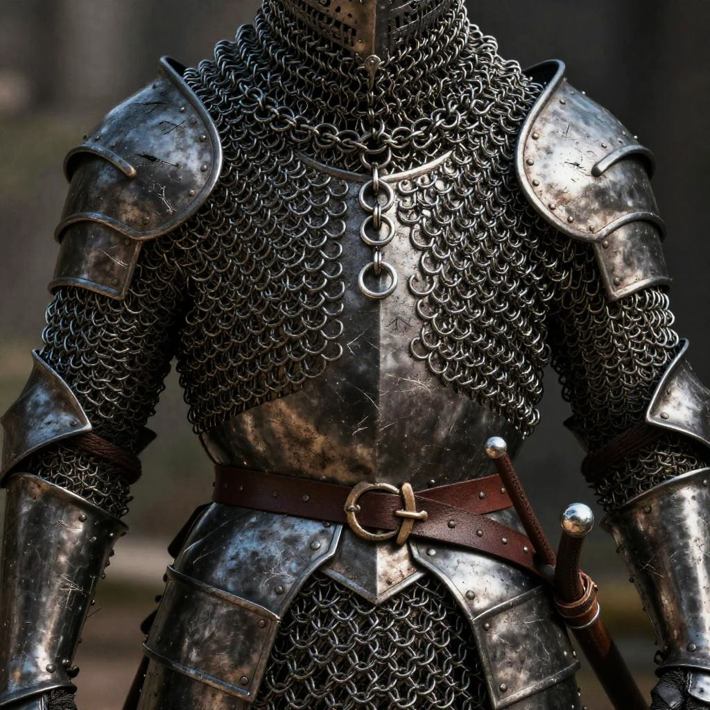 Welsh armor detailed close-up, medieval warrior wearing ornate celts-inspired plate armor, intricate patterns, weathered metal, standing in misty forest background, cinematic lighting