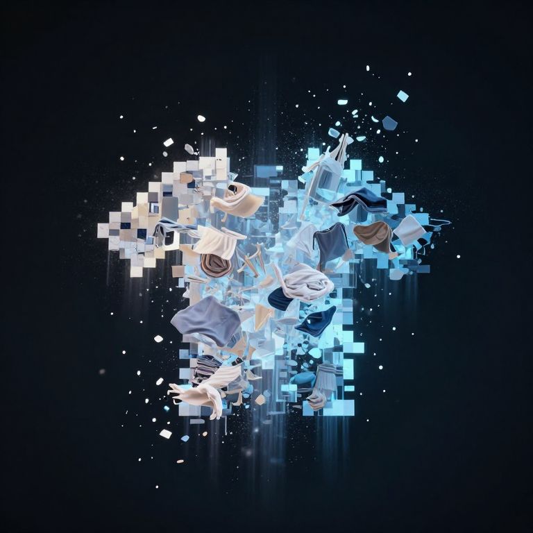Clothing remover theme represented by an abstract creative interpretation, showing clothes gently dissolving into pixels or light beams, set against a dark background with glowing fragments, futuristic and surreal atmosphere.