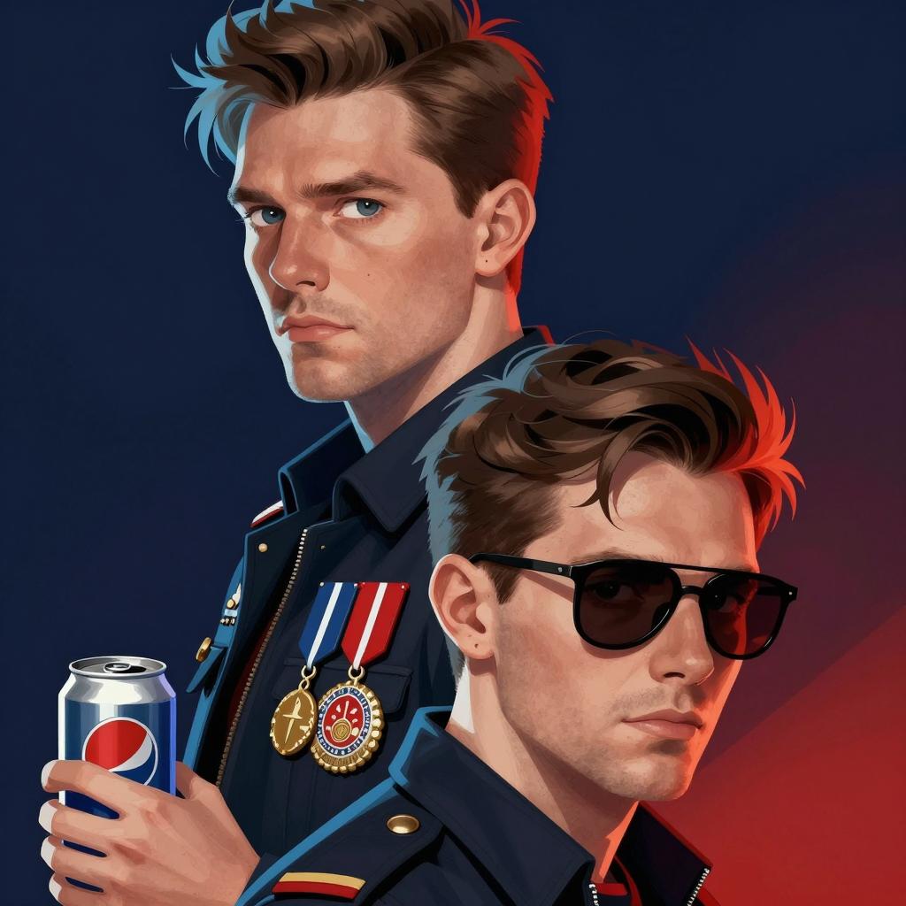 Digital illustration of two men. Top man has intense gaze, short brown hair, blue tint, wearing dark jacket with medals. Holds soda can in left hand. Bottom man has short brown hair, wears sunglasses, red tint, dark jacket. Both have serious expressions. Background is dark blue and red. Men overlap slightly.