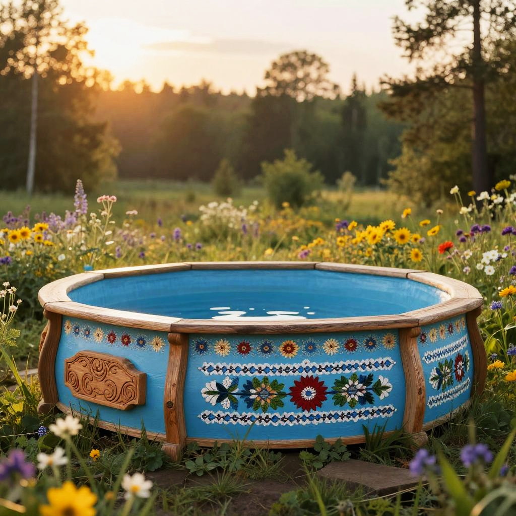 Circular outdoor pool decorated in traditional Russian folklore style featuring colorful floral patterns and wooden carvings. The pool is set among wildflowers and lush greenery with a forest backdrop during golden hour, creating a peaceful and enchanting atmosphere.