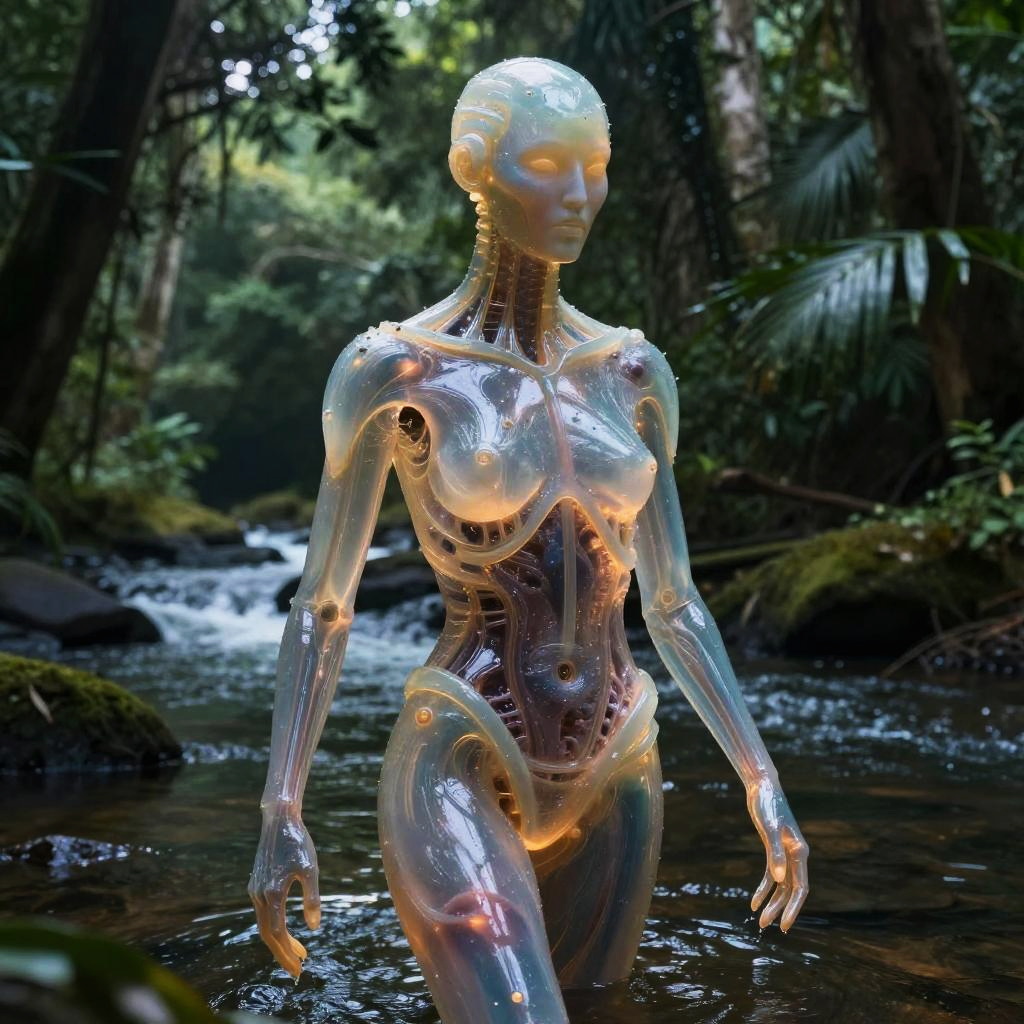 Detailed photos of something humanoid made entirely of otherworldly luminescent and translucent liquid materials, on night jungle river, you can see all the inside of his body, supranatural style, realistic style, infinite ultra high definition image quality and rendering, infinite image detail, infinite realistic render, infinite realistic RTX global illumination, infinite special effect